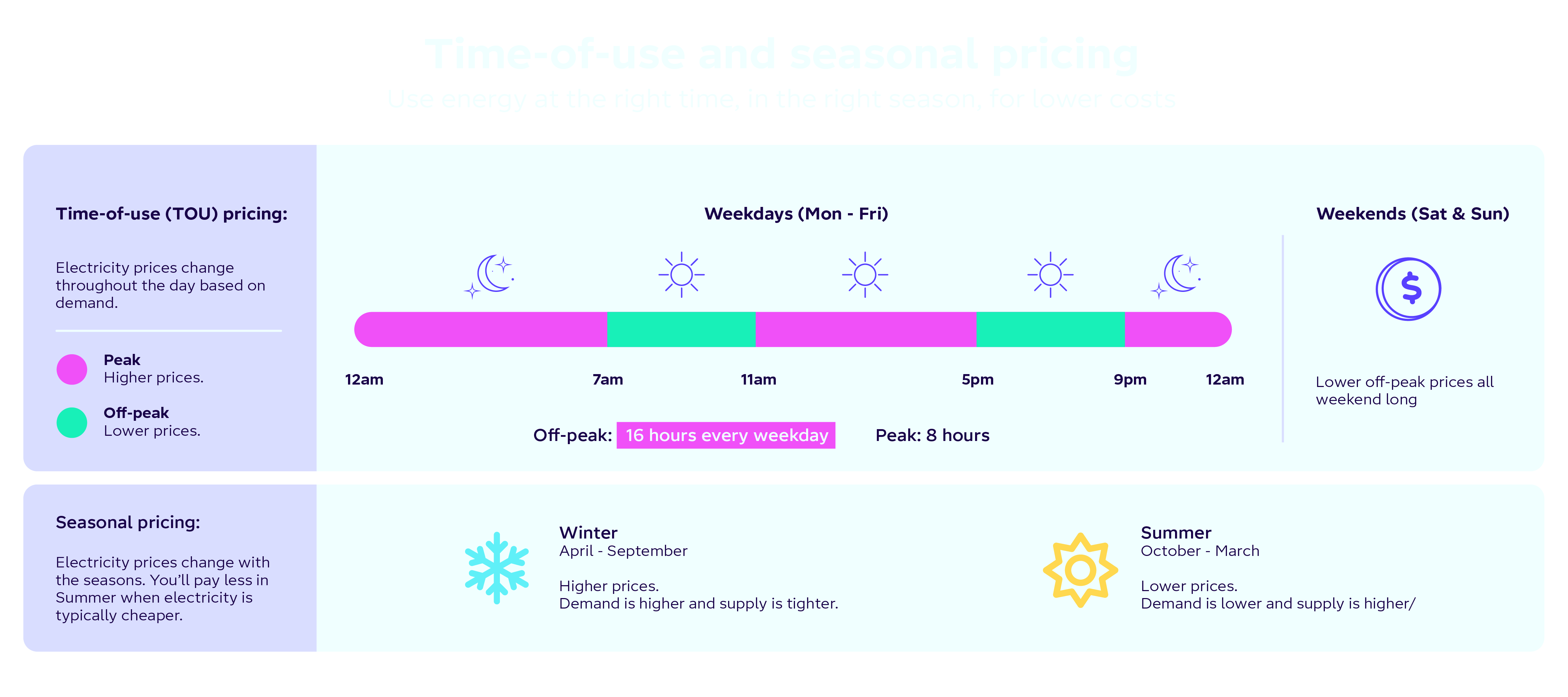 That’s why we offer up to 16 hours of off-peak pricing every day (11am-5pm & 9pm-7am weekdays, and all weekend). We also combine TOU with seasonal (Winter: April - September | Summer: October - March) pricing, so you benefit from lower rates when electricity is cheaper, especially over summer.
